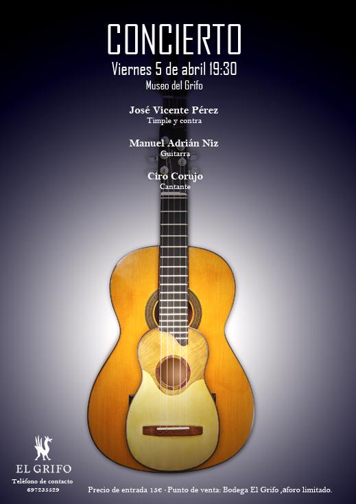El Museo de Bodegas El Grifo acogerá un nuevo concierto de timple, guitarra y voz a cargo del trío musical formado por el solista Ciro Corujo, timplista José Vicente Pérez y el guitarrista Manuel Adrián Niz el viernes, 5 de abril.