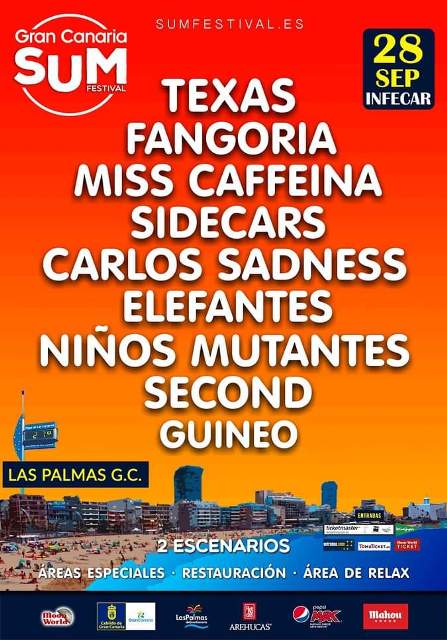 Texas y Fangoria encabezan el cartel de la segunda edición del Sum Festival, un evento que se celebrará el sábado, 28 de septiembre, en la ciudad de Las Palmas de Gran Canaria, concretamente en Infecar. Por su parte, Miss Cafeína, Elefantes, Sidecars, Niños Mutantes, Second, Carlos Sadness y Guineo, completan la propuesta musical del festival.