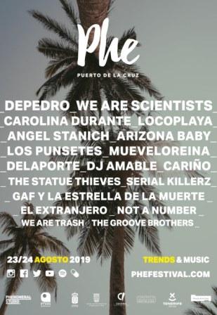 Puerto de La Cruz acogerá la cuarta edición del PHE Festival. El cartel de este año está compuesto por: Depedro, We Are Sciencitsts, Arizona Baby, Mueveloreina, Ángel Stanich, Carolina Durante, Los Punsetes, Delaporte, Locoplaya, Dj Amable, Cariño, The Statue Thieves, Serial Killerz, GAF y la estrella de la muerte, El Extranjero, Not a Number, We Are Trash y The Grove Brothers.
